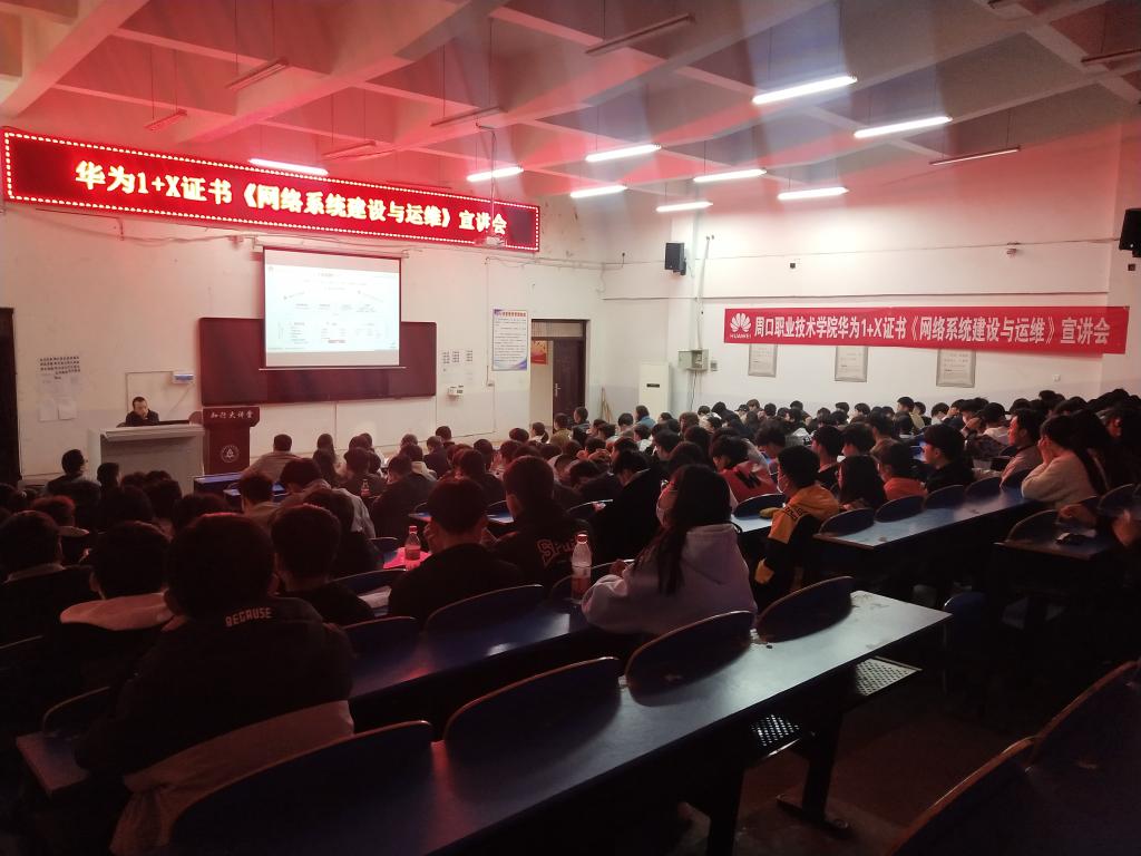 为全面贯彻《国家职业教育改革实施方案》精神,推进产教融合,进一步落实“1+X”证书制度试点工作,加快我院各专业人才培养工作的发展,提升学生专业能力,人人摸人人看于3月24号下午2:30在五区多媒体一楼举行“华为1+X证书网络系统建设与运维”宣讲会,人人摸人人看全体教师,19级、20级计算机网络技术专业全体学生和计算机应用技术专业部分学生代表参加了此次宣讲会,会议由副院长陈鹏主持。