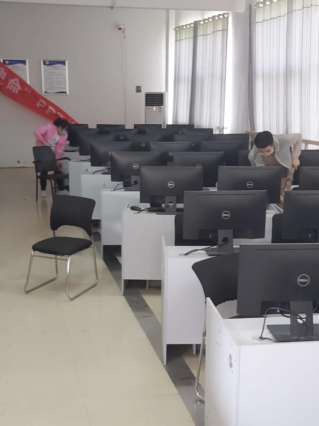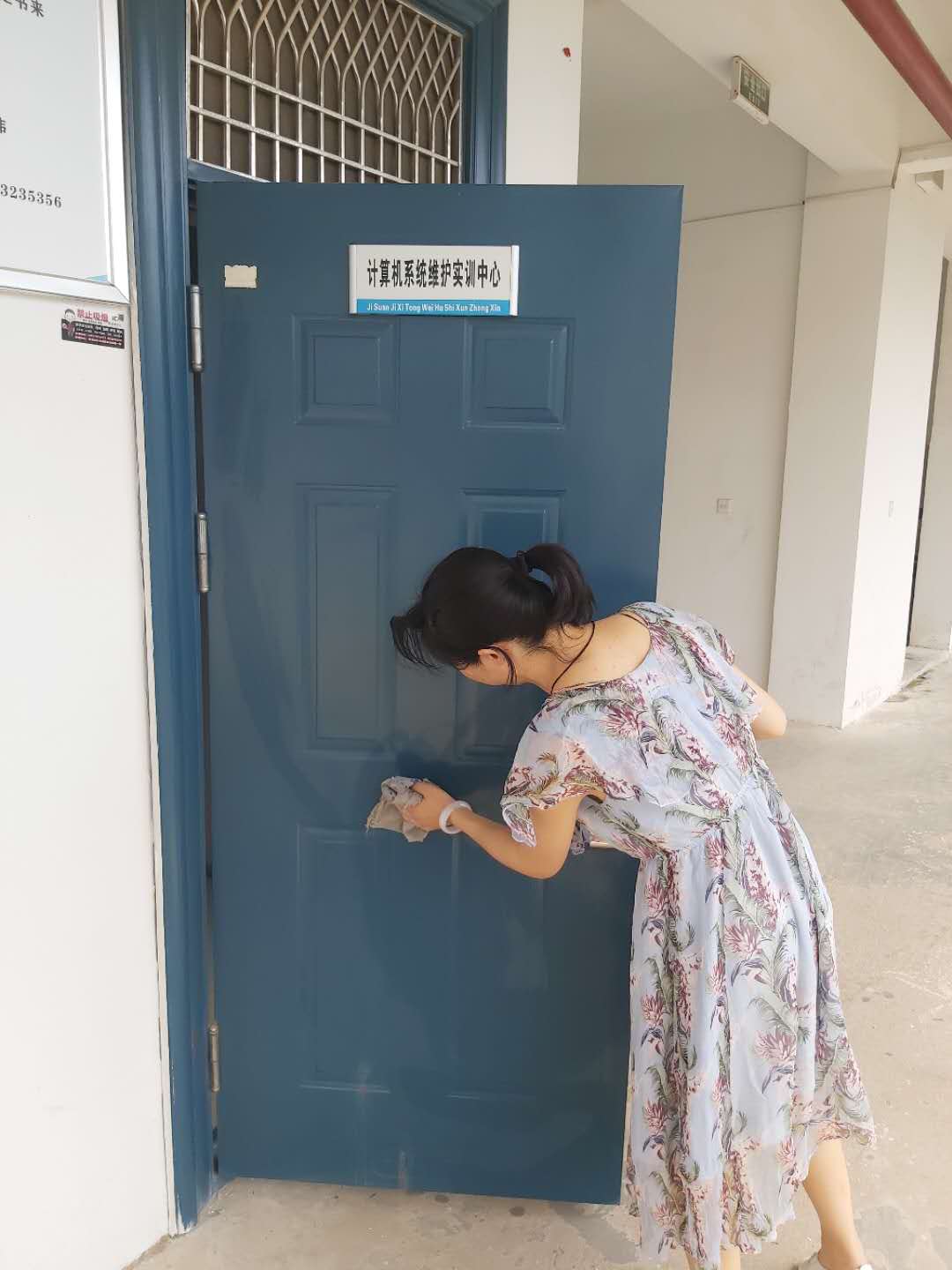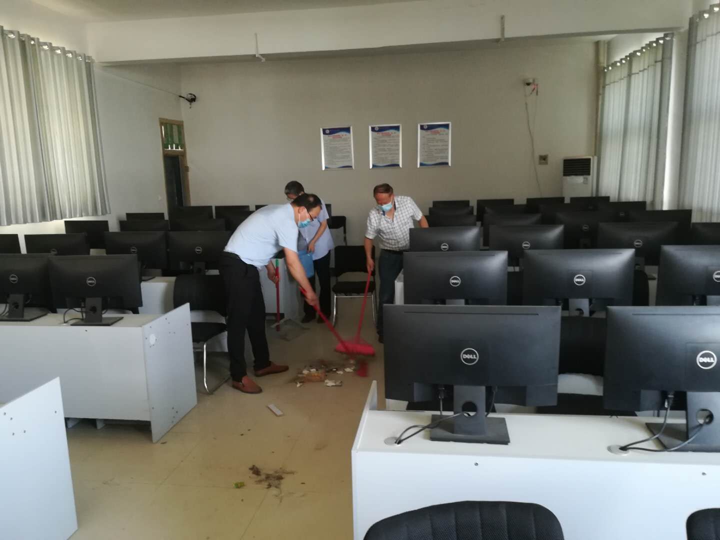 我院党总支书记李强、院长李思广亲自动手打扫,老师们深受鼓舞,大家发扬不怕脏、不怕累的精神,按照分工全方位打扫每一间教室和每一间实训室,不留任何死角,并进行全方位消毒。