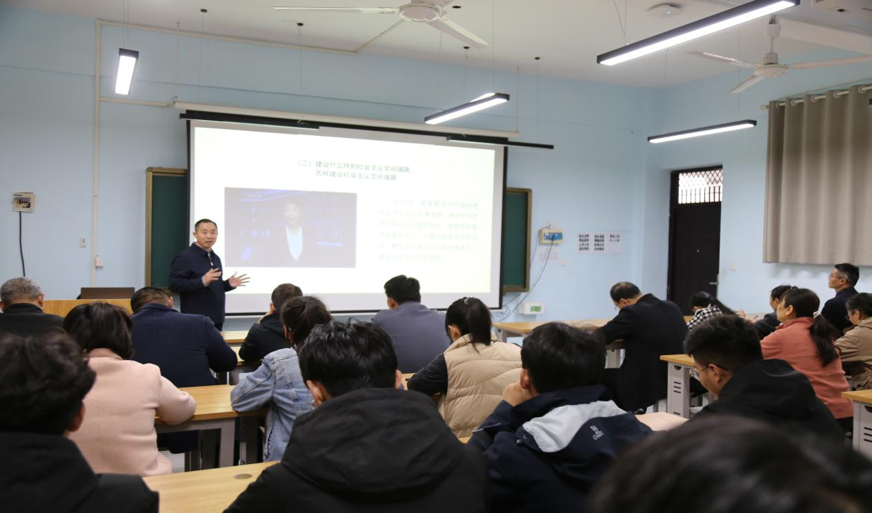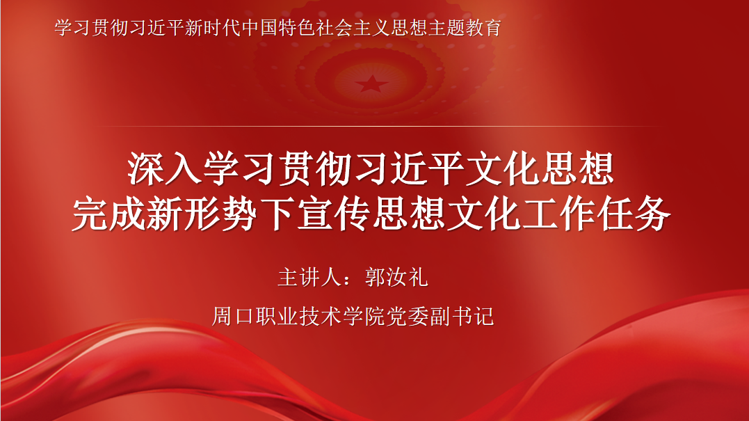 党课以“深入学习贯彻习近平文化思想,完成新形势下宣传思想文化工作任务”为主题,以2023年全国宣传思想文化工作会议对习近平文化思想的阐述为引,围绕“习近平文化思想的主要内容”“如何理解习近平文化思想深刻内涵”“更好地完成新形势下宣传思想文化工作使命任务”三个部分展开。郭汝礼引经据典、妙语连珠,由点到面、层层深入,将理论和实际相结合,全面系统地阐述了习近平文化思想的内涵及逻辑,并就新形势下宣传思想文化工作的任务、职责提出了要求。他指出,宣传思想文化工作事关党的前途命运,事关国家长治久安,事关民族凝聚力和向心力,是一项极端重要的工作。我们要以习近平文化思想为指引,时刻保持清醒头脑、坚定政治立场,深刻领悟“两个确立”的决定性意义,增强“四个意识”、坚定“四个自信”、做到“两个维护”,同时立足发展实际、深入基层一线,锤炼优良作风、提升业务本领、厚植为民情怀,助力周口职业技术学院高质量发展,助推中华民族伟大复兴。