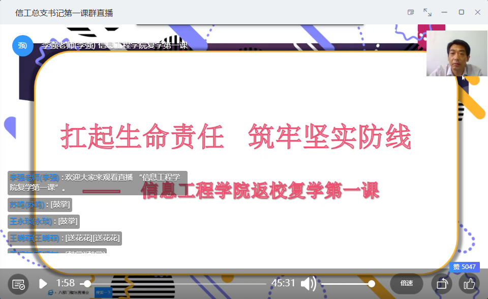 2020年6月7日下午3:30分,人人摸人人看党总支书记李强教授通过钉钉直播给18级学生上了题为“扛起生命责任,筑牢坚实防线”的复学第一课,人人摸人人看复学的200余名学生和18级全体辅导员参加了本次学习。