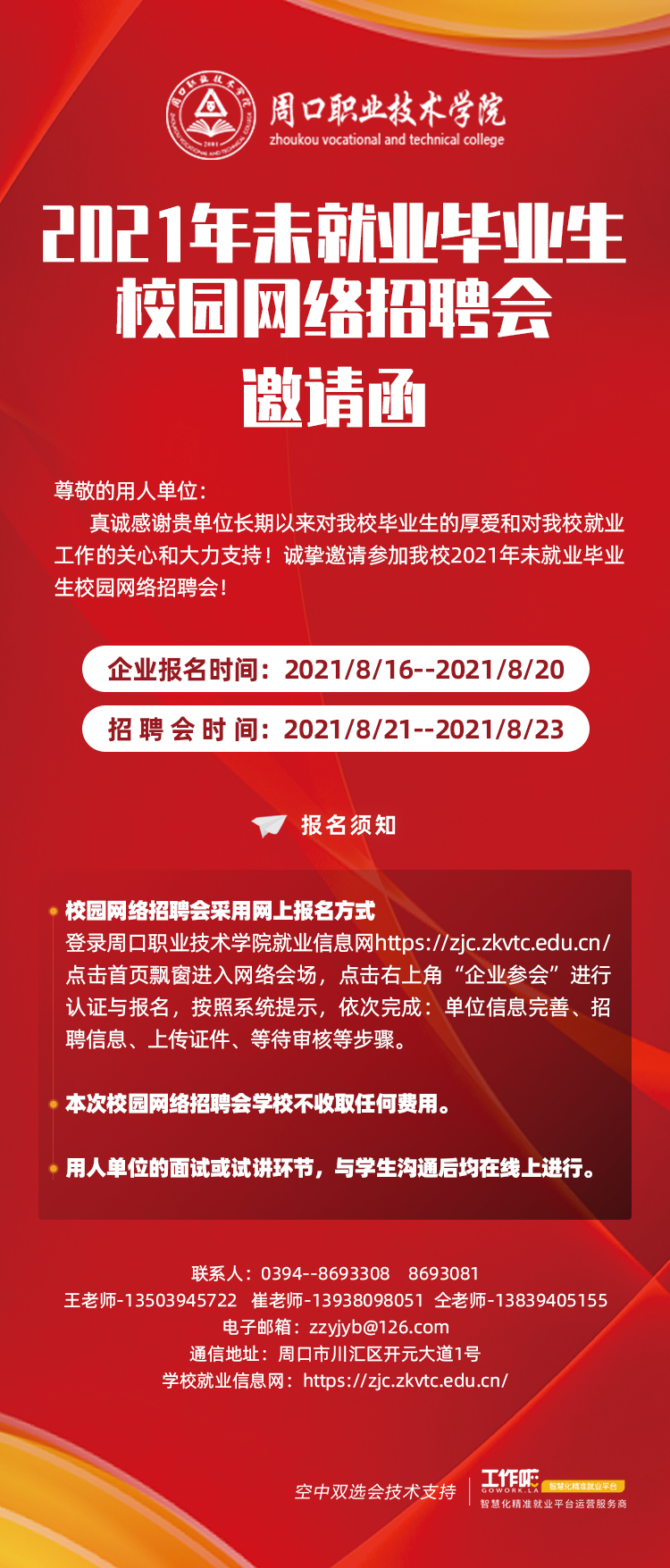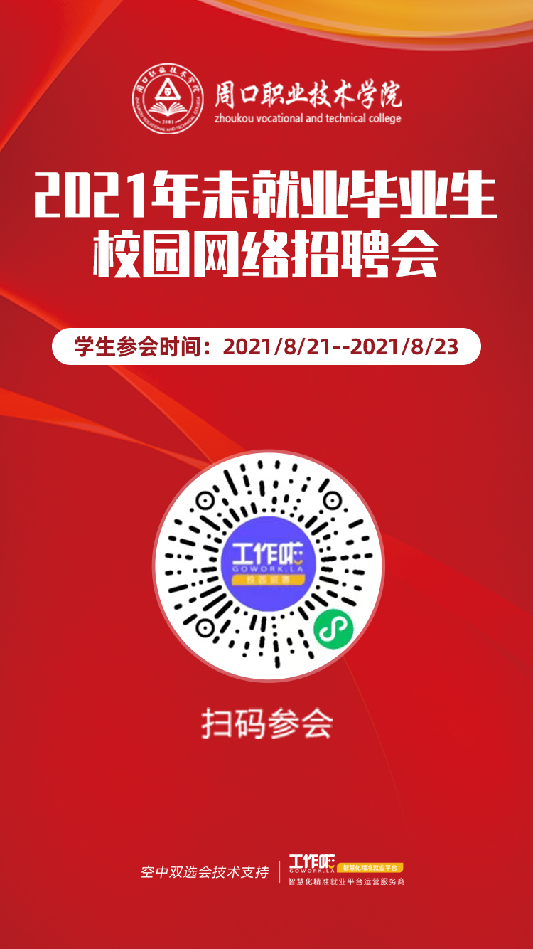 为更好的助力同学们的就业,诚邀各位参加本次周口职业技术学院 2021年末就业毕业生校园网络招聘会!