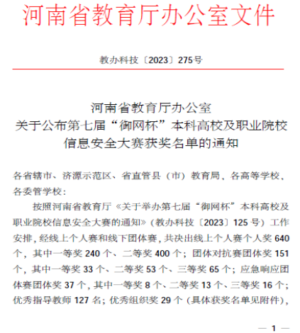 近日,河南省教育厅办公室下发了文件《关于公布第七届“御网杯”本科高校及职业院校信息安全大赛获奖名单的通知》(教办科技〔2023〕275号),我院学子再获佳绩,取得多项奖励,其中线上个人挑战赛一等奖12项,线下团体对抗赛一等奖1项、二等奖2项,线下应急响应团体赛三等奖1项,李学威、王晓菲、黄宇达三位老师被评为优秀指导教师。